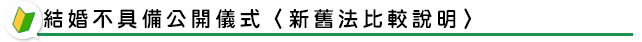 另民法親屬編施行法第四之一條規定:「中國民國96年5月4日修正之民法第九百八十二條之規定,自公布後一年施行。」因此,有關結婚之形式要件自九十七年五月二十三日起已修正為「書面」、「二人以上證人之簽名」及「結婚登記」,至於舊法所規定的公開儀式已被刪除,未來新人結婚是否採行公開的結婚儀式已經不是必須具備的要件。