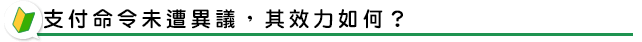 依民事訴訟法第五百二十一條:「債務人對於支付命令未於法定期間合法提出異議者,支付命令與確定判決有同一之效力。」亦即債務人若未於二十日之不變期間提出異議,支付命令即可確定,而具有與確定判決同一之效力,好像雙方打了一場官司,並已獲得法院勝訴判決確定一般。此際,債權人所執有之支付命令裁定及確定證明書正本即屬強制執行法第四條第一項規定之執行名義,債權人可依據此等執行名義另向法院聲請強制執行,以查封拍賣債務人之財產。