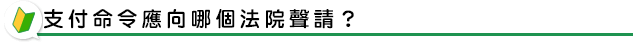 聲請支付命令須向債務人之住所地或營業所在地之管轄法院聲請民事訴訟法第五百十條參照。此項管轄規定係屬專屬管轄,即使雙方有特別約定也不能排除。倘債權人違反此項專屬管轄之規定,法院將裁定駁回其支付命令之聲請民事訴訟法第五百十三條參照。