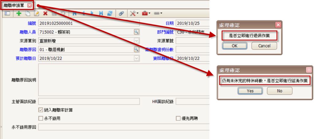 使用效果:於人員到職、離職時自動提醒需進行加退保作業、特休未休自動結算