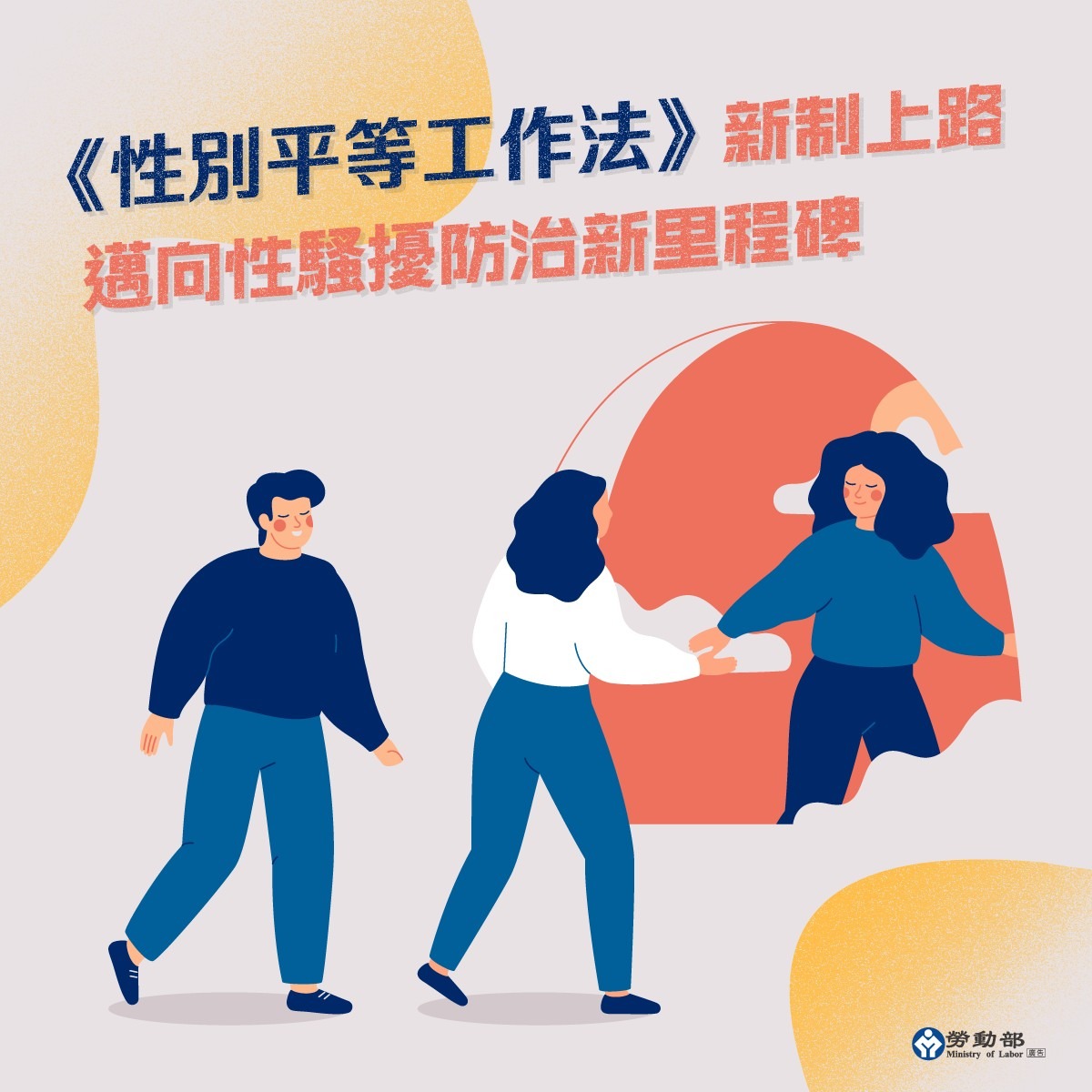 職場性騷擾防治邁向新的里程碑!《性別平等工作法》有關職場性騷擾防治的新規定,於今(8)日正式施行,新制度除了強化雇主的防治意識及責任,明定雇主不論是否接獲被害人提出申訴,或是聽聞有性騷擾之情形,都要採取立即有效的糾正及補救措施,並應提供或轉介諮詢、醫療或心理諮商等協助,完善被害人保護及扶助制度,另建立外部公權力申訴調查機制、增訂最高負責人或僱用人為性騷擾行為人之行政罰等,周延保護被害人,遏阻職場性騷擾事件發生。